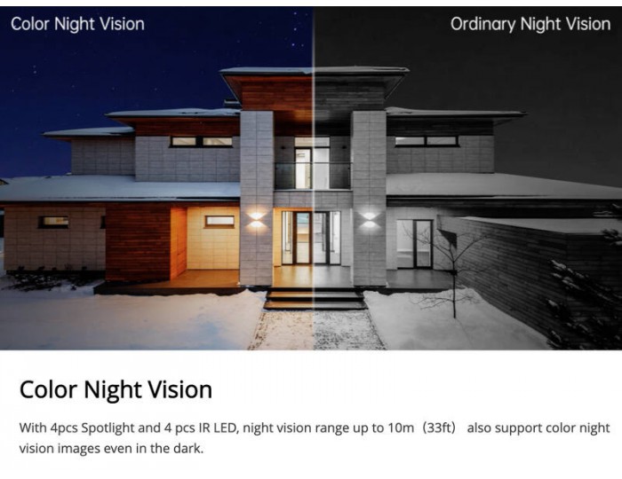 COLOR NIGHT VISION – Built-in spotlight and infrared LEDs allow the camera to capture colour images at night while also supporting standard infrared night monitoring.