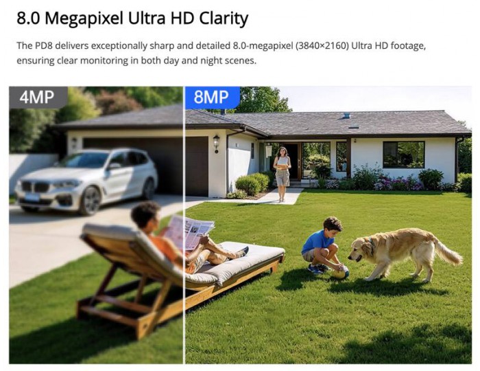 ULTRA CLEAR 4K VIDEO – The PD8 records in 4K (8MP) resolution (3840 × 2160), delivering sharper images and more detail than standard Full HD cameras. WDR technology helps maintain clear images in both bright and low-light conditions.