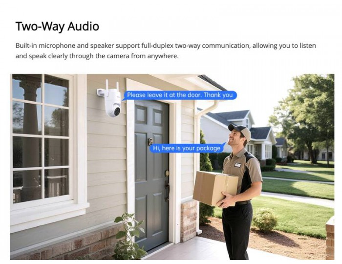 TWO-WAY AUDIO – Built-in microphone and speaker support full-duplex two-way communication.