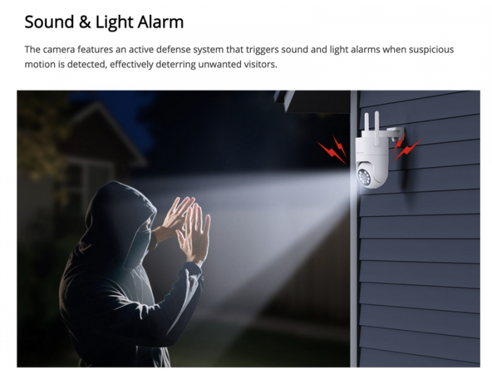 SOUND & LIGHT ALARM – Built-in spotlight and siren can be triggered when motion is detected to help deter unwanted visitors.