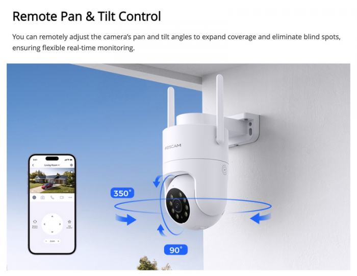 REMOTE PAN & TILT CONTROL – Control the camera remotely through the Foscam mobile app with 350° pan and 90° tilt to monitor a wide outdoor area.