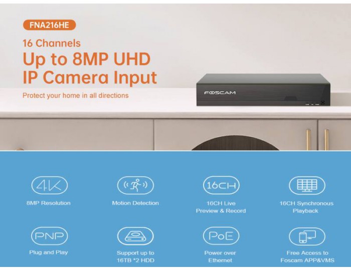 16 CHANNEL 4K / 8MP POE NVR – The Foscam FNA216HE supports up to **16 IP cameras** with recording resolution up to **8MP (4K)**, making it suitable for home, office, warehouse and retail security systems.