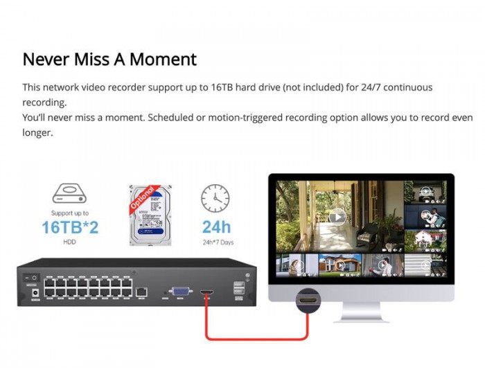 BUILT-IN POE PORTS – With **16 integrated PoE ports**, cameras can connect directly to the NVR using a single Ethernet cable for both power and data, simplifying installation and reducing cabling.