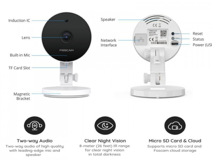 MULTIPLE STORAGE OPTIONS – Supports local recording to MicroSD card (max 256GB), NVR, FTP server or optional Foscam Cloud service.